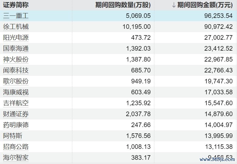 163家上市公司股票获回购,三一重工回购金额最高163家上市公司股票获回购,三一重工回购金额最高