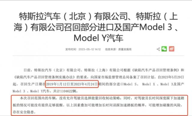 也正是因为有较大的安全风险,2023 年,国家市场监督管理总局启动缺陷调查后,特斯拉召回了 2019-2023 年间销售的大量车型,原因就包括了"未允许驾驶员选择能量回收策略,可能增加误踩加速踏板风险"。
