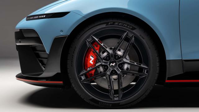 为了匹配 IONIQ 6 N 的性能输出,现代在新车上配备了前四活塞、后单活塞的制动卡钳,以及专为 6 N 开发的 275/35 R20 倍耐力 P Zero 5 轮胎,车辆尾部也配备了天鹅颈式后扰流板来增加下压力。